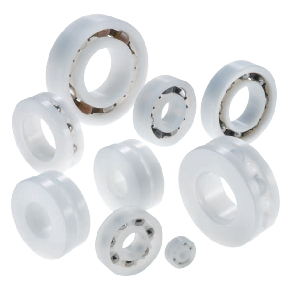Polymer ball bearings consist of: ? Polymer rings ? Balls made of stainless steel, glass, polymer or other materials and ? A polymer cage. Polymer ball bearings can be made from a variety of materials and material combinations. The materials selected depend on the application. Polymers have signifi...